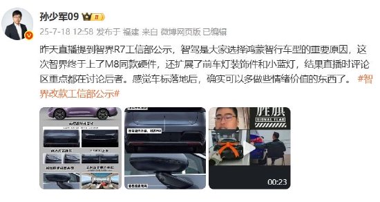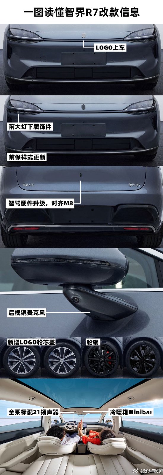 爆料称,新款智界车型全系标配激光雷达,智驾硬件直接对齐问界M8,带来ADS 4;同时LOGO上车,新增后视镜麦克风、主副驾零重力座椅等多项车内外配置,还扩展了前车灯装饰件和小蓝灯,整体配置提升巨大,用户期待拉满。